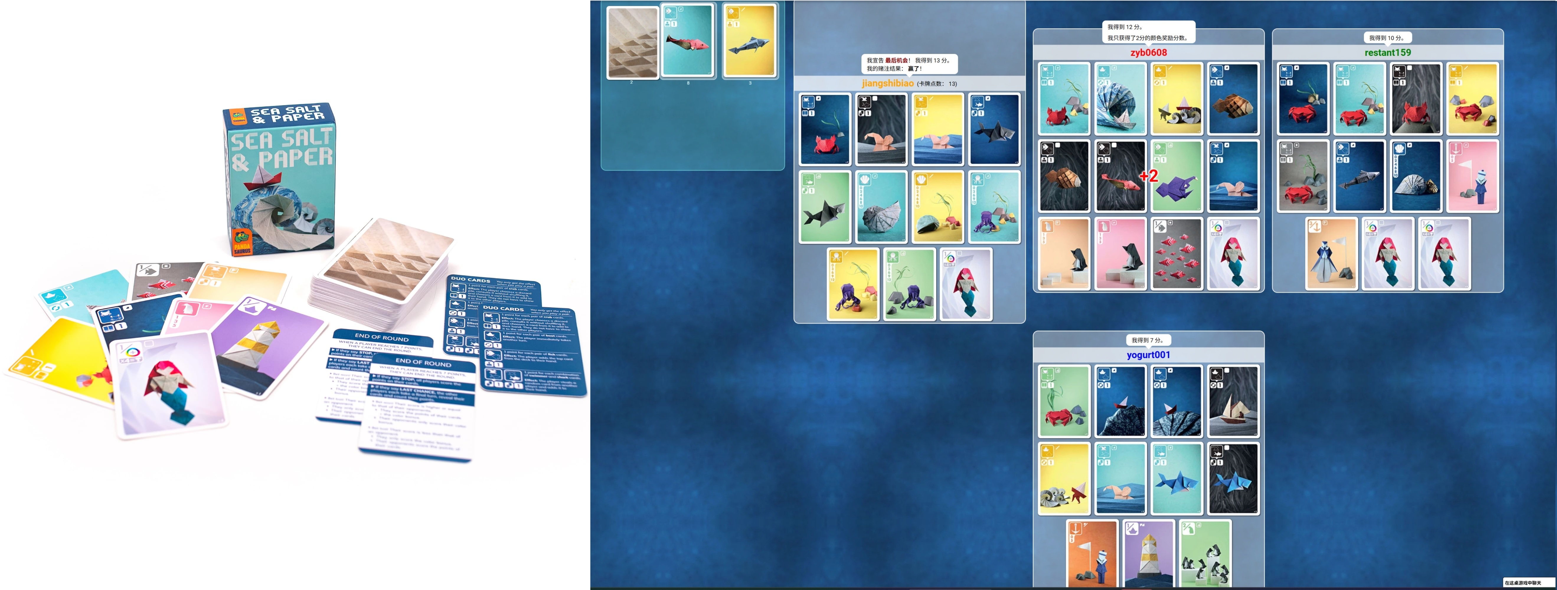 《海盐折纸》以其独特的手绘折纸风格吸引眼球,规则简单、得分结构清晰:玩家通过收集相同颜色或类型的卡牌来组成得分组合,同时要判断何时喊出"最后一轮"来获得额外奖励。这应该是成套收集里最简单的桌游了,重度类似于 faraway,算是《自然和弦》、《森森不息》的推新版。当然和很多桌游一样,二人对弈时博弈性很强(既要构建自己的组合又要干扰对手的计划)而多人游戏时就比较混沌,会出现谁要站出来去卡领先方的问题。