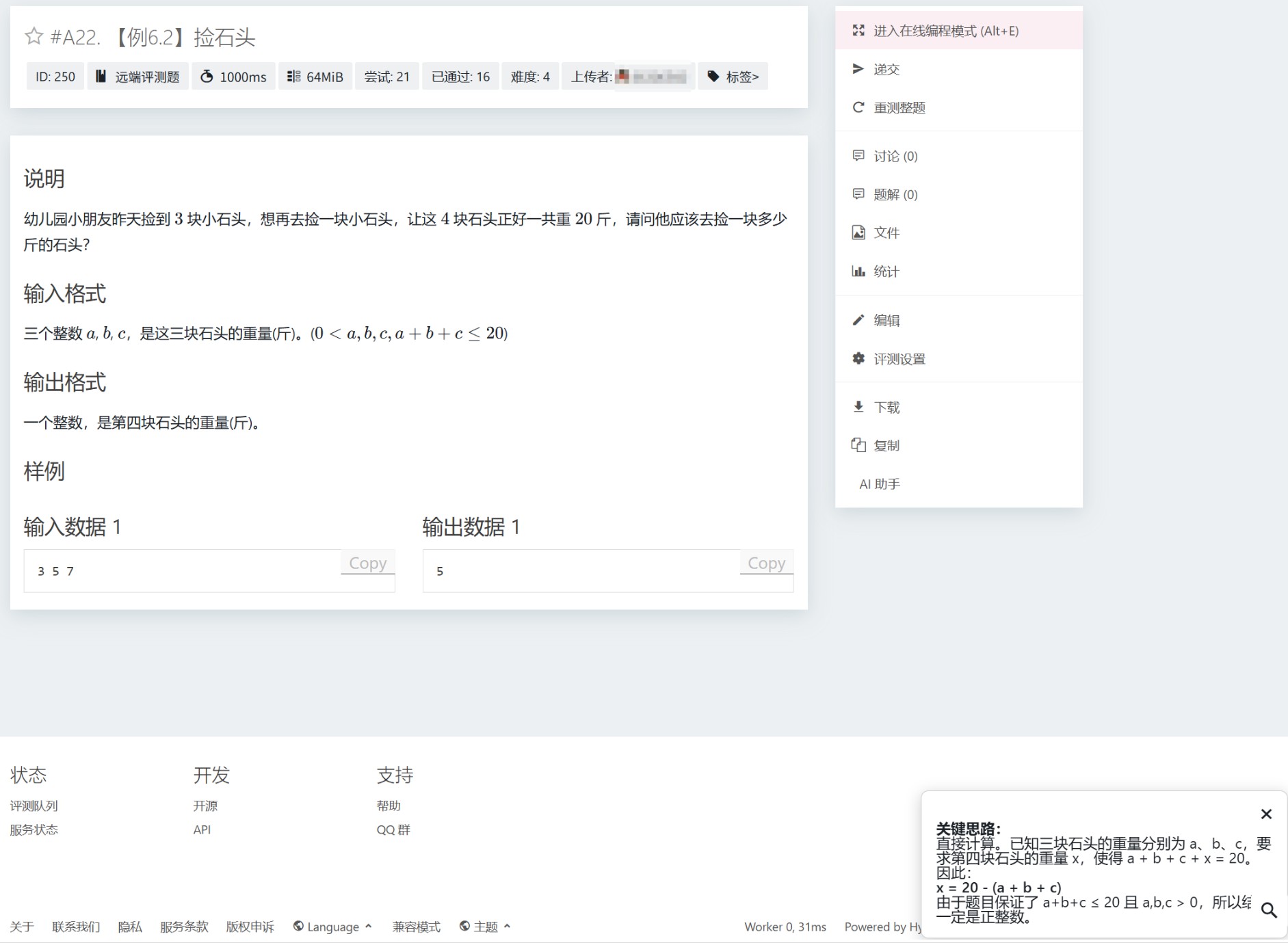 我妈正在搞少儿编程教学,基于开源的 Hydrooj 搭了一套 OJ。她很希望能借助大模型的能力辅助孩子们日常的刷题训练,希望我能帮忙集成大模型用于 难题解答 和 代码查错 。我们不妨把这两个场景叫做 AI 助手 和 AI 查错 。
