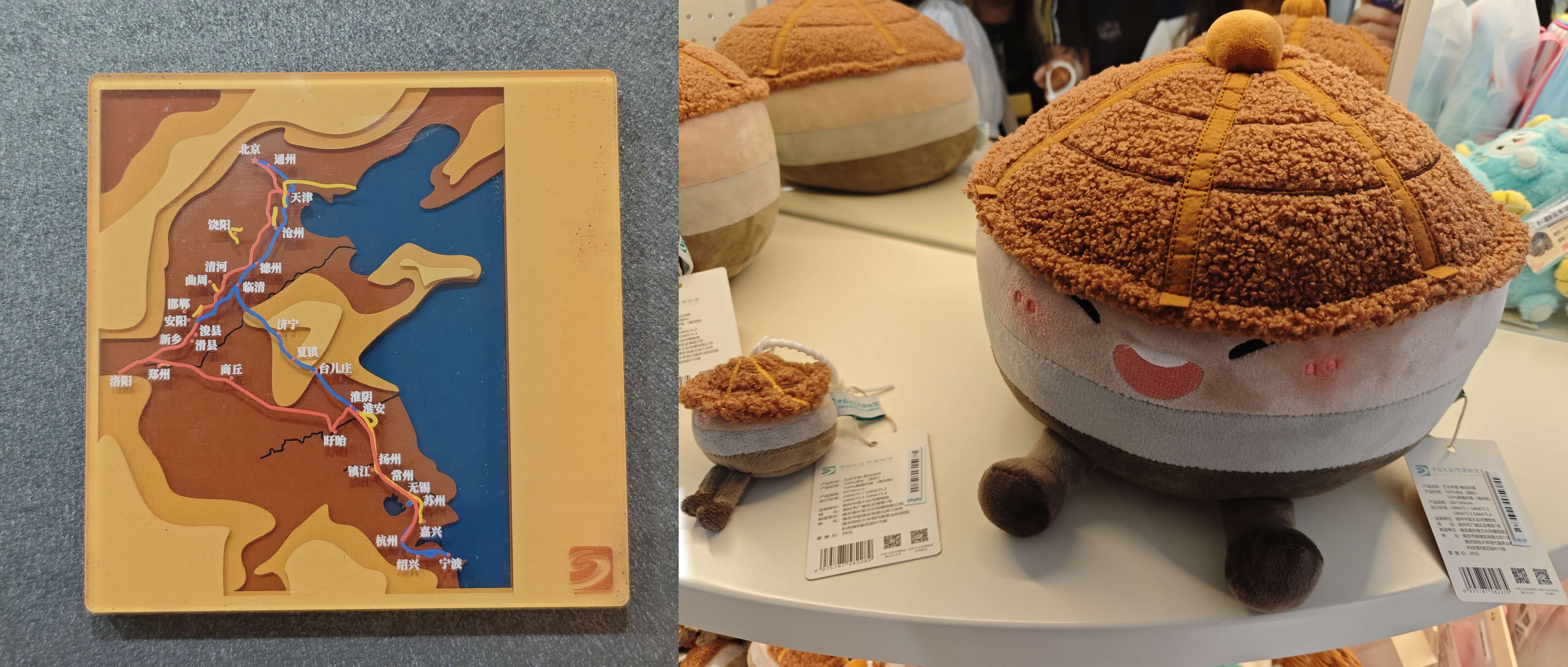 返回一楼时已接近闭馆,我们幸运地赶上了纪念品店的最后一波人流。旅游的地方越多,对纪念品的要求就越高:我除了一眼就相中一块记录着大运河历史路线变迁的冰箱贴外,没有别的喜欢的了;励颖对着两个谷仓玩偶怔怔发呆,小的 大的 (只能解释成这个 IP 的授权费用在 左右),本着性价比原则抱着大的回去了。