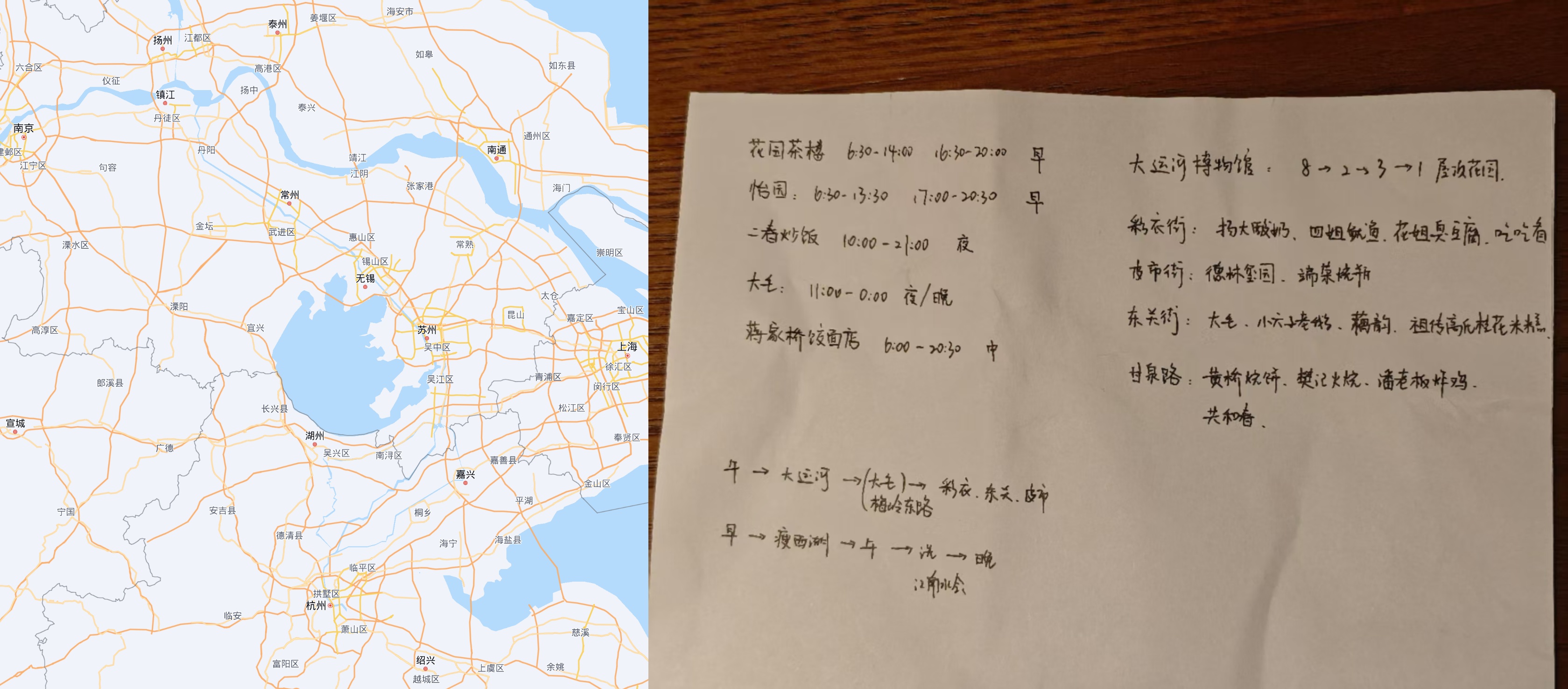 结合我俩的公共空闲时间,我订了周六 去程和周日 回程的高铁,都需要在南京南中转(实测下来南京南的中转体验很丝滑)。扬州特色主要包括自然风光(瘦西湖)、饮食(早茶,炒饭)、人文(大运河博物馆,东关街等老街)和休闲(扬州三把刀)。大家对运河博物馆的推荐度很高,我提前一周预约了门票。攻略主要由励颖制作,她充分调研了扬州的街坊和饮食,精确到这两天里的一日三餐安排。