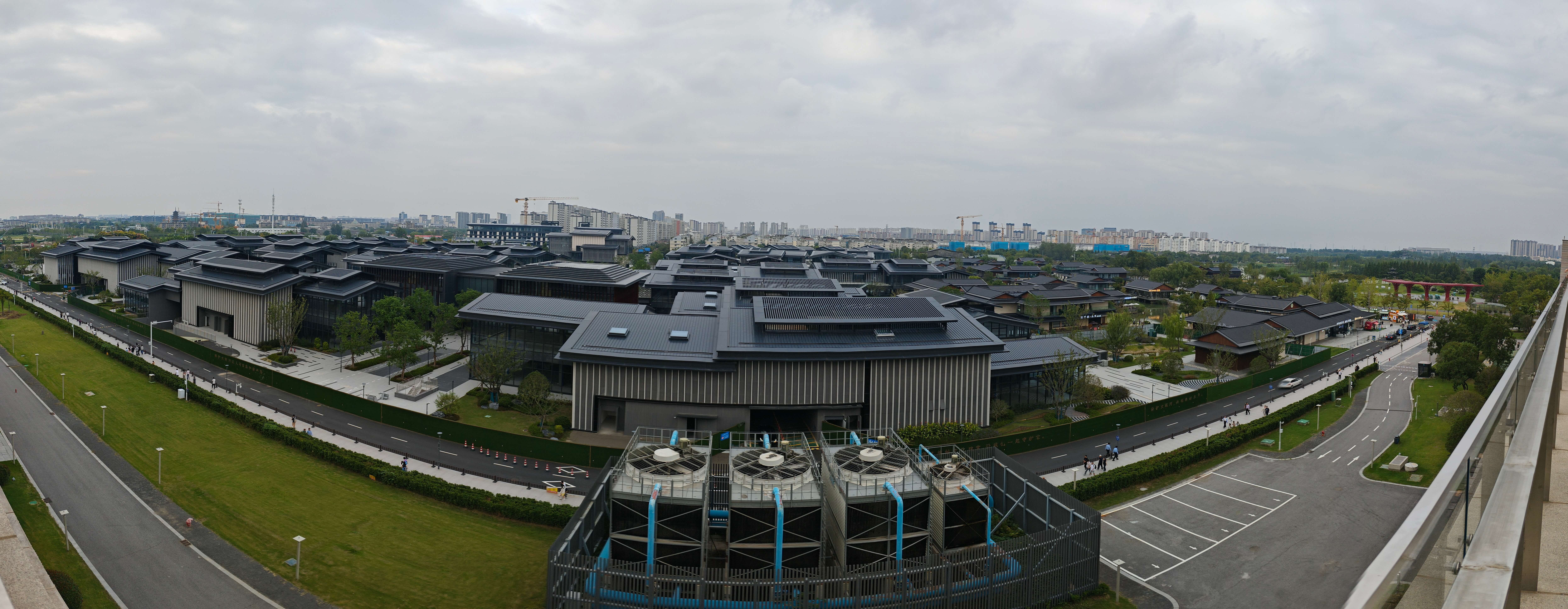 我们没忘记去顶层的 屋顶花园 吹风。大运河博物馆坐落在扬州三湾古运河畔,从顶层眺望四周风景极佳:一侧水光荡漾流淌着古运河,边上有一座没有开放的塔;另一侧可以远眺三湾风景区,建筑风格古色古香。